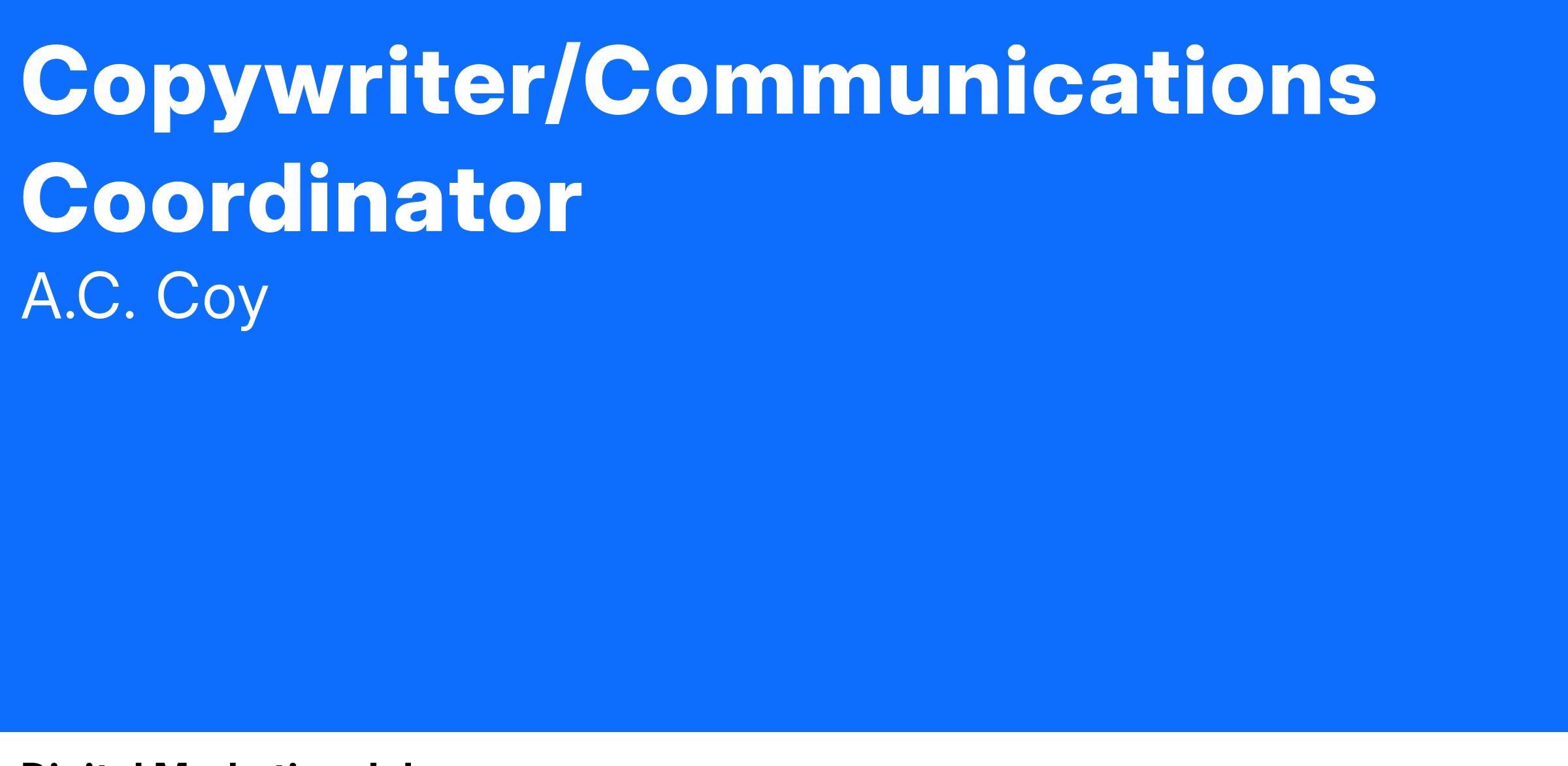 The A.C.Coy has an immediate need for a Copywriter/Communications Coodinator. Qualified candidates will be responsible for writing, editing, and proofreading a variety of content.