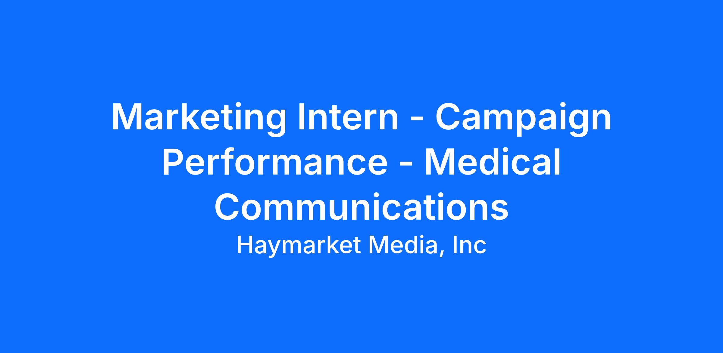 Haymarket Media, Inc. is seeking a Marketing Intern to join the Campaign Performance Team, supporting the promo and PPC teams across the Medical Communications, myCME, NACE, and McKnight’s brands. This position is located in our New York, NY office, with three days on-site (Tuesdays, Wednesdays, and a team flex day) and two days remote.
