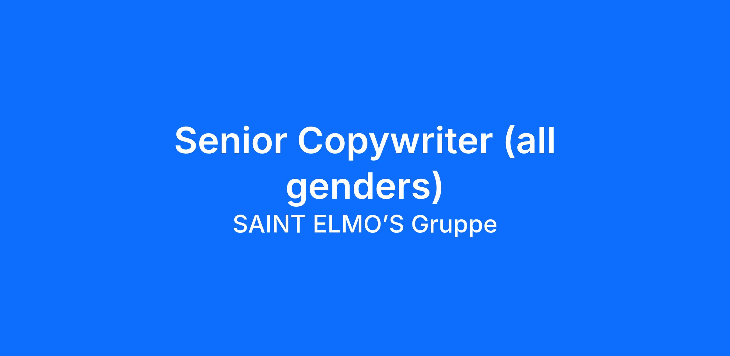 Zum nächstmöglichen Zeitpunkt suchen wir für Saint Elmo's am Standort Hamburg einen Senior Copywriter (all genders).