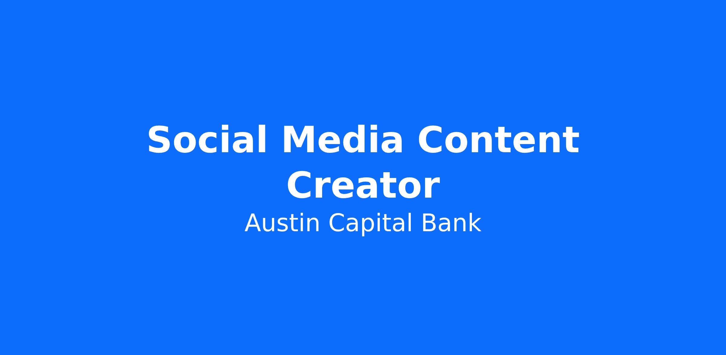 About the Role: Are you a creative powerhouse with a knack for crafting viral content? Austin Capital Bank is seeking a Social Media Content Creator to be the vibrant voice of our brand and products across social media. You'll be instrumental in making our innovative offerings household names. This is a unique opportunity for a proactive, mission-driven communicator and social media expert to drive significant brand awareness and engagement.