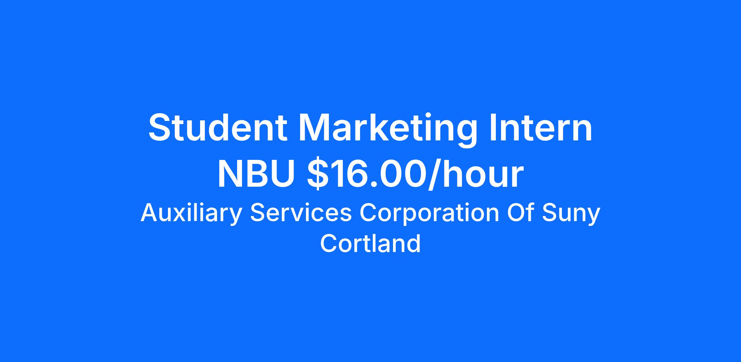 DescriptionSUNY Cortland Auxiliary Services is looking to hire a dynamic student intern to assist with student engagement, social media marketing, outgoing communication, and campus outreach, as well as many other business categories that may come up throughout the year operating a major food-service organization that serves nearly 7,000 meals per day. The person selected for this role will be comfortable speaking with students, faculty, and employees. They will also be confident in their ability to interact with our customers, post on social media in a professional manner, and will always be a considerate representative of the mission and values of SUNY Cortland Auxiliary Services.