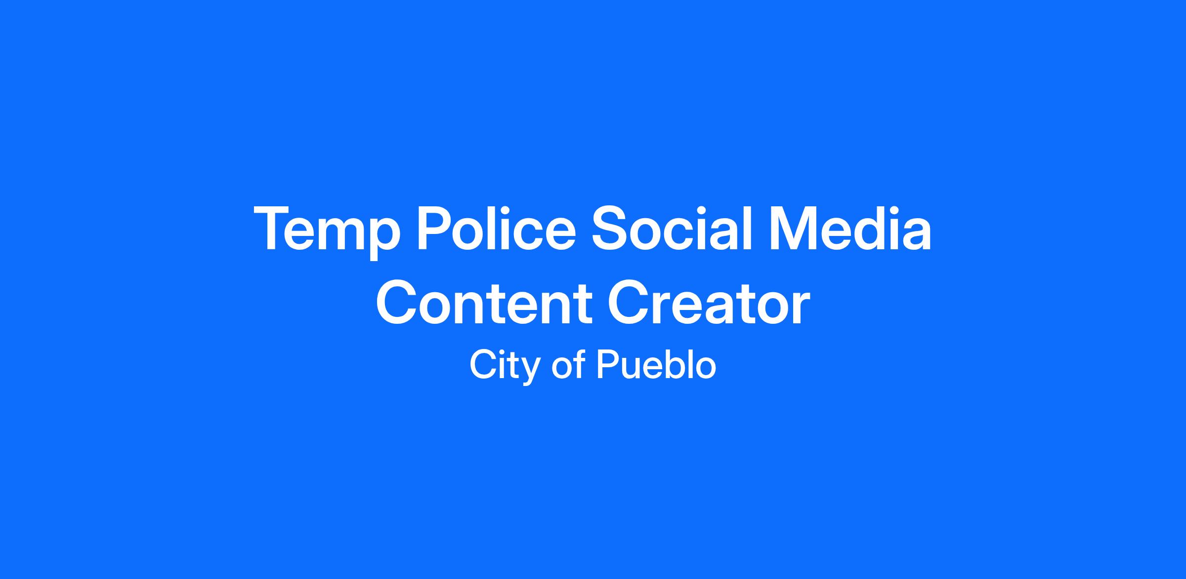 This is a temporary/part-time, non-exempt position limited to 1300 hours annually. This position works in the Pueblo Police Department under the supervision of the PD Community Engagement Manager. The Temp Social Media Content Creator plans, drafts, ?lms, edits, and posts social media on various platforms including Facebook, Instagram, and X (formerly known as Twitter). This position also works collaboratively with internal work groups and utilizes creative development to enhance the image of the Pueblo Police Department.